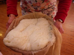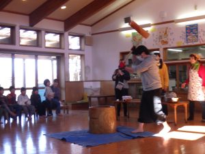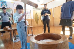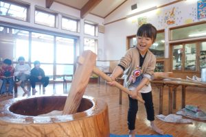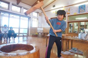 お手伝いのお父さんと職員で4キロのもち米を2回つきました