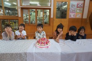 10月誕生会ブログ 10月の誕生会が行われました! 今月は、幼児さんの中で6人が誕生日を迎えます。みんなで「むっくりくまさん」を歌って おいかけっこをして楽しんでから、お楽しみの 「ふれあい牧場」が園庭で始まりました!