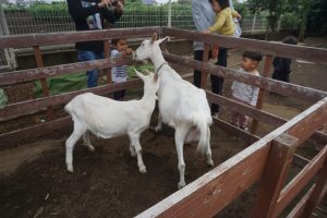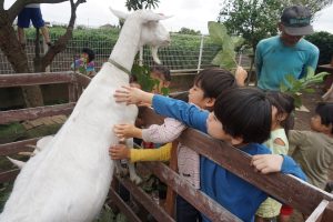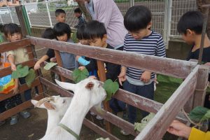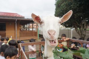 あかね保育園近くにあって、いつもお世話になっている オギノエンファームから、メスヤギ1頭、子どものヤギ1頭が あそびに来てくれましたよ。 メスヤギはとっても大きくて、 顔を近づけられると迫力がありました。