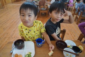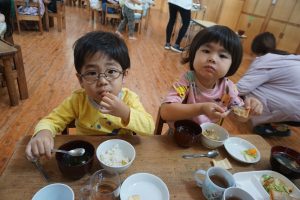 子どもたちは早速寄って行って、 エサの葉っぱをあげようとしていました。 「こっちだよー」「これ食べてー」 「食べてくれないなあ…」 とヤギに向かって沢山話しかけていました。 エサを食べてもらうと嬉しそうでしたよ! 乳児さんは大きなヤギにちょっとドキドキ… 体を撫でる事もできて、貴重な経験をさせてもらいました。 お昼ご飯は、栗ご飯・春巻き・サラダ・お吸い物。 沢山食べた子どもたちです。 特に春巻きはおかわりが止まりませんでした!