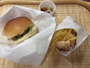 その後は大交流会でした。この日のメニューはあかねバーガー、唐揚げ、ポテト、コロコロサラダでした。