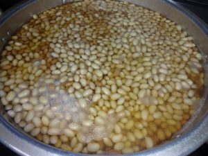 給食室で朝から5時間かけて茹でたりふかしたりした大豆はふっくらしていてとてもいいにおいがしました