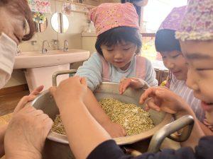 「もうつぶれた~?ここにもまだお豆があるよ~!」もうできたね