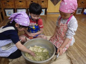 塩の塊を探す子、つぶしてくれる子みんなで「おいしくな~れ」と混ぜました